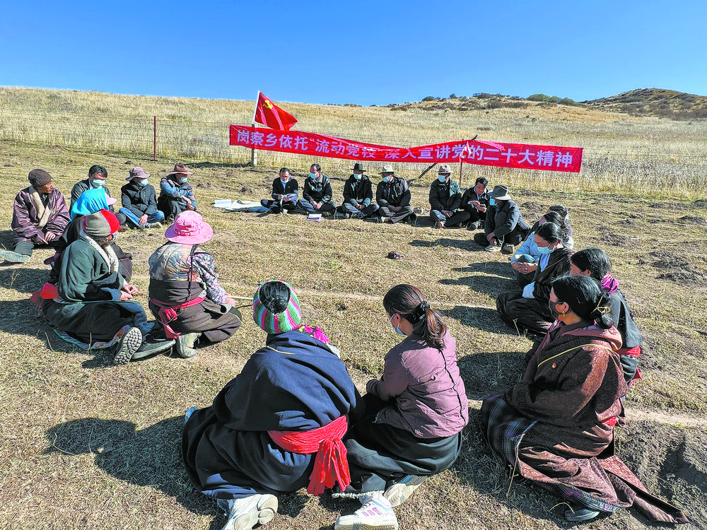 在晨曦照耀下的苏化村瓦能定居点,党员牧民围坐在一起,认真聆听着二十大精神宣讲。一面党旗、一台电脑、一个话筒,一群熟悉的身影,他们就是岗察乡“流动党校”宣讲队讲师。