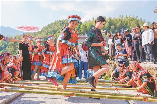 11月9日农历十月十六,在全州县绍水镇桐油村,瑶族同胞以织瑶锦、打糍粑、跳竹竿舞、对山歌等多种形式欢庆盘王节,吸引众多游客前来体验。唐广东/摄