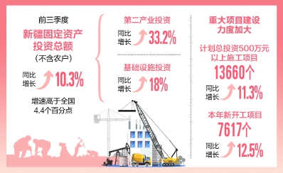 本报乌鲁木齐11月2日讯 石榴云/新疆日报记者石鑫从自治区统计局获悉:前三季度,新疆固定资产投资总额(不含农户)同比增长10.3%,增速高于全国4.4个百分点,居全国第5位。在受疫情影响情况下,新疆投资强度仍保持两位数增长,展现出很强的韧性。自治区统计局党组书记孙中震表示,今年以来,自治区深入实施项目带动战略,稳增长稳投资政策持续发力,各地区各部门积极推动重大项目开工建设,不断扩大投资规模,积极主动应对疫情带来的不利影响,为保持全区经济运行在合理区间提供了关键支撑。