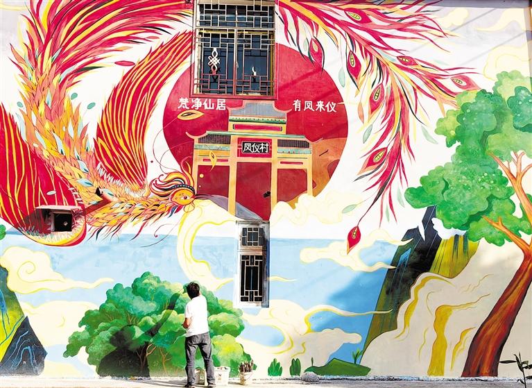 记者见到了这些墙画的绘制者杨颖,他正拿着颜料与画笔为金色凤凰作色。“我出生在农村,我的理想就是要用手中的画笔,为家乡添景、为乡村增色。”7年前从外省返乡的杨颖,越来越坚定自己描绘乡村美景的心愿。
