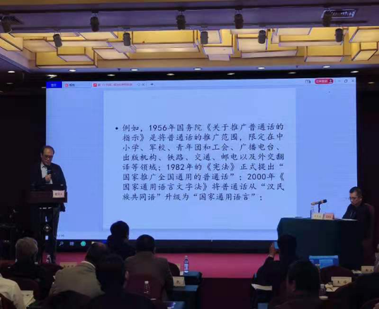 中国社会科学院民族学与人类学研究所研究员、中国突厥语研究会会长黄行研究员作了题为《我国民族地区与时俱进的推普政策》的学术报告。他认为梳理我国少数民族地区推普的政策发展,对于理解当前民族地区普通话的普及状况,制定更加准确的“推普”政策很有帮助。我国民族地区的语言正处于一个重要的特殊时期,推普工作具有重大意义,同时常态状态下保持民族地区语言政策的稳定性也不容忽视。