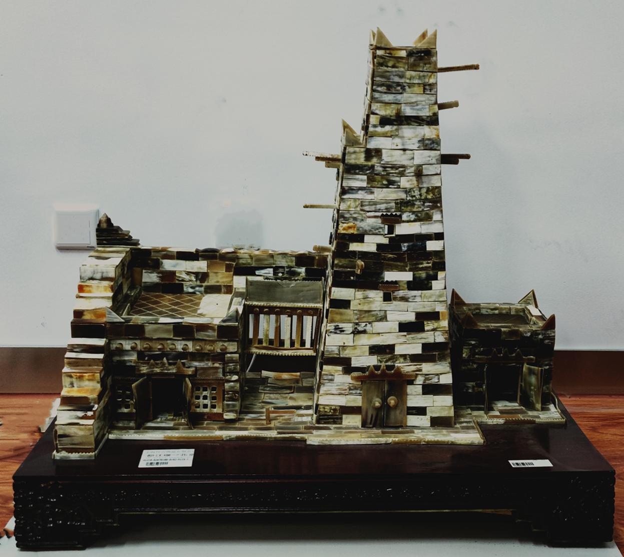 据悉,此座羌族居所模型通体由牦牛角薄片制成,为孙宏开先生80岁寿诞时由羌族同胞赠与。模型分为碉楼、卧室、罩楼以及院坝等布局,清晰地将羌族“有序而时,有度而变,变而有常”的独特居住空间模式表现出来,初步揭示了羌居住文化的概况。